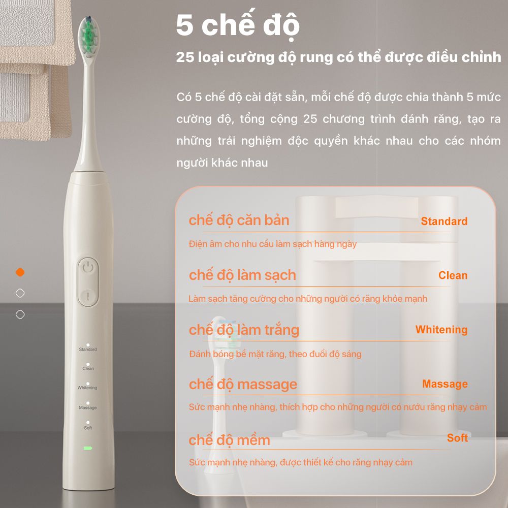 Bomidi TX5 không chỉ được trang bị 5 chế độ đánh răng, mà còn đi kèm với 5 cấp độ sức mạnh riêng biệt cho mỗi chế độ. Máy có chế độ Standard dành cho vệ sinh hàng ngày, chế độ Cleaning với lực đánh mạnh hơn phù hợp với những người có răng khỏe. Ngoài ra, thiết bị còn hỗ trợ hai chế độ cho những người có tình trạng răng miệng không tốt: chế độ Massage dành cho người có nướu yếu và chế độ Gentle với tần số rung thấp nhất, phù hợp cho những người có răng hàm nhạy cảm. Cuối cùng, máy cũng có một chế độ Whitening chuyên biệt để làm trắng răng.