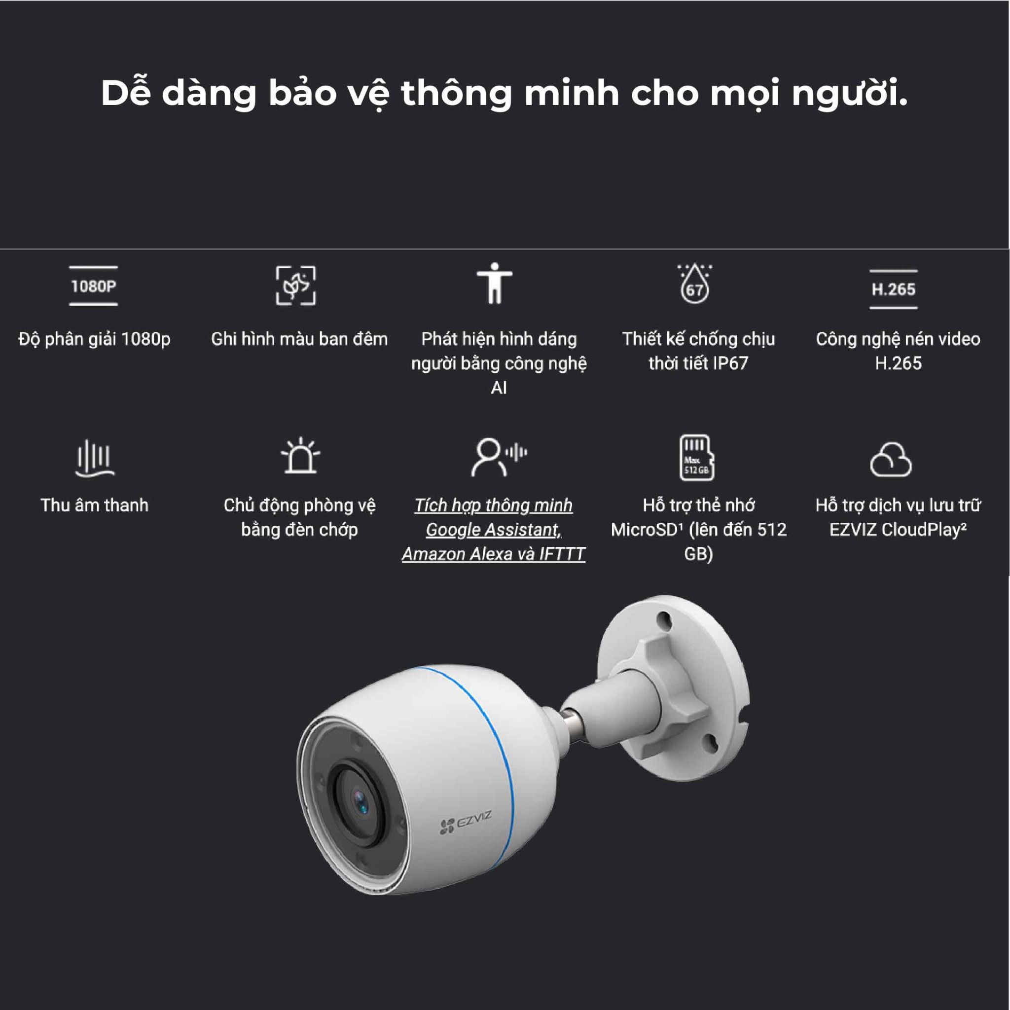 Với tiêu chuẩn chống thời tiết khắc nghiệt IP67, Camera Wifi EZVIZ ngoài trời 2MP 1080P H3C2MPC có thể hoạt động ổn định dưới mọi điều kiện thời tiết.