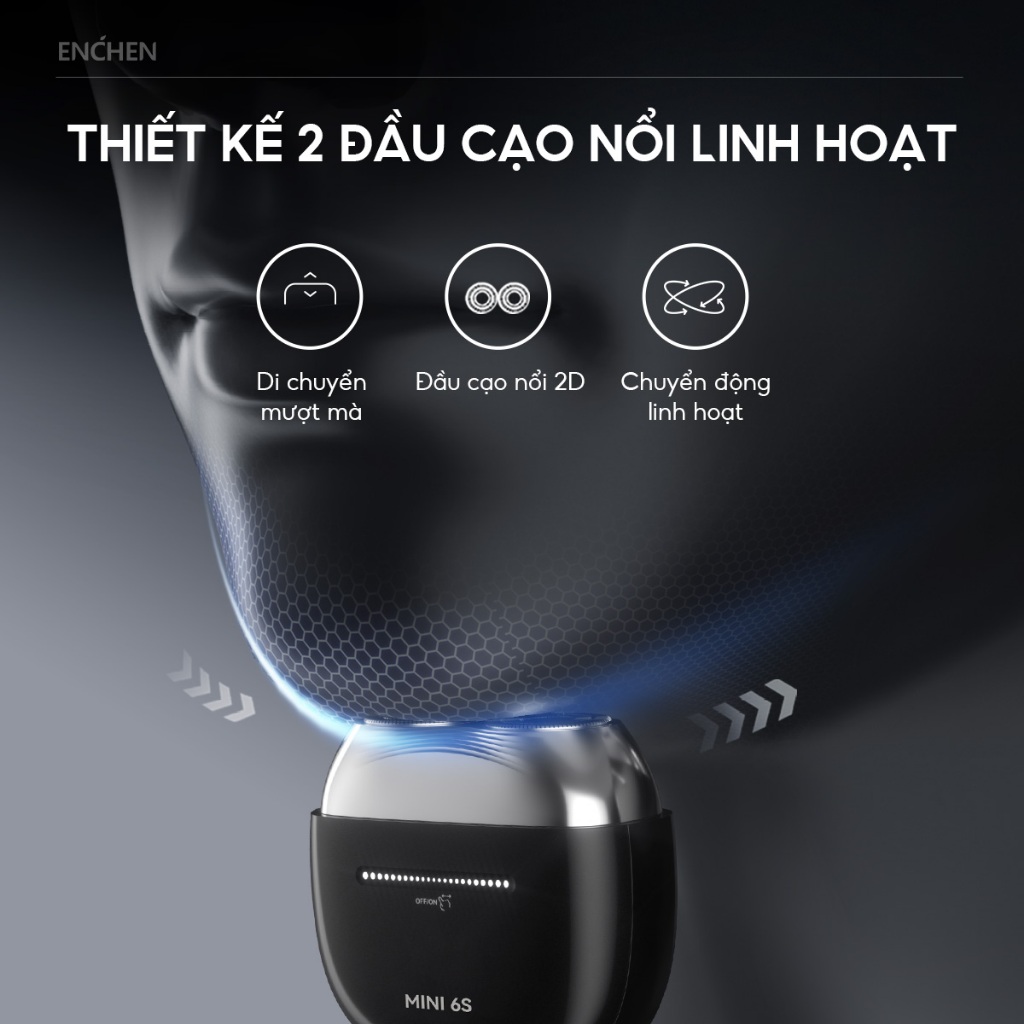 - Đầu Cạo Nổi Đa Năng: Đầu cạo nổi độc lập tích hợp lò xo đàn hồi của máy cạo râu Enchen Mini 6 có thể tùy chỉnh linh hoạt theo đường nét khuôn mặt
