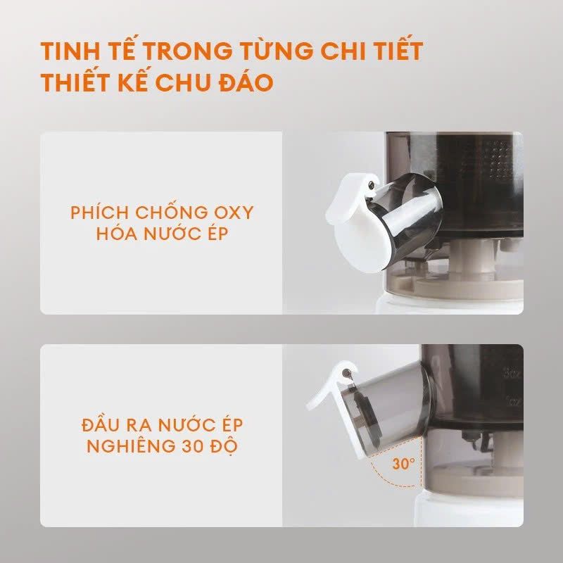 Sản phẩm được trang bị hai vòi riêng biệt, nghiêng khoảng 30 độ, giúp bã được đẩy ra dễ dàng và nước ép chảy ra một cách chính xác mà không bị bắn tung tóe khi đổ vào cốc.