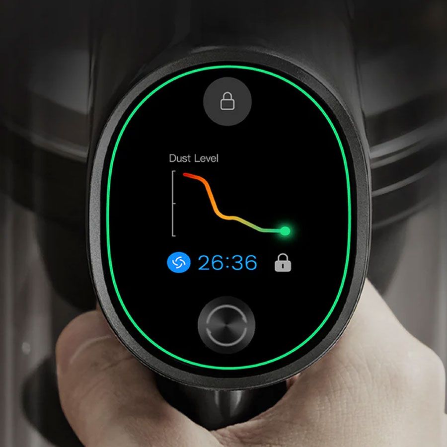 Máy cũng trang bị cảm biến để xác định lượng bụi bẩn, hiển thị thông qua biểu đồ màu sắc theo thời gian thực: màu đỏ cho biết bụi nhiều, màu cam cho biết bụi trung bình, và màu xanh cho biết ít bụi.