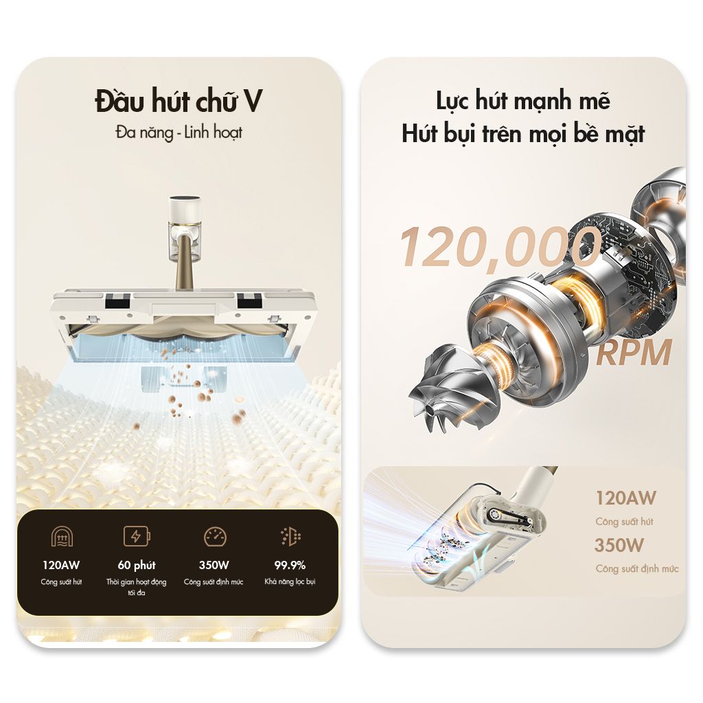 Máy hút bụi Dreame hoạt động với công suất 350W, mang lại hiệu quả làm sạch cao với lực hút tối đa đạt 20000 Pa.