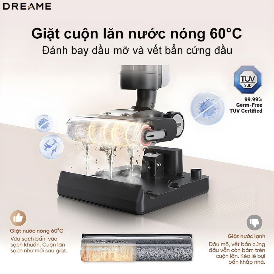 Máy hút bụi lau nhà Dreame H13 Pro tích hợp tính năng tự giặt con lăn bằng nước nóng 60°C, giúp loại bỏ hiệu quả các vết bẩn cứng đầu, đảm bảo sàn nhà luôn sạch bóng.