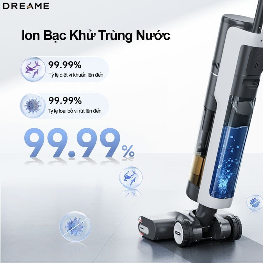 | Tiện ích | Có động cơ không chổi than Cảm biến phát hiện độ bẩn Màn hình LED Bánh xe trợ lực GlideWheel Có lau sàn nước nóng Tích hợp 3 biệp pháp khử khuẩn, diệt trùng: cuộn lăn ion bạc, hộc nước bẩn ion bạc và công nghệ tự điện phân nước Đèn LED s |