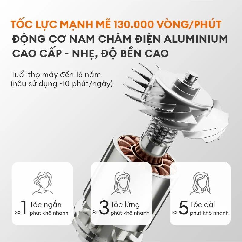 Máy sấy tóc Gaabor HD-M01C sở hữu động cơ mạnh mẽ với tốc độ lên tới 130.000 vòng/phút, tạo ra luồng gió 64m/s, giúp tóc khô nhanh và dễ vào nếp. Với mái tóc dài, chỉ cần khoảng 5 phút để sấy khô hoàn toàn.