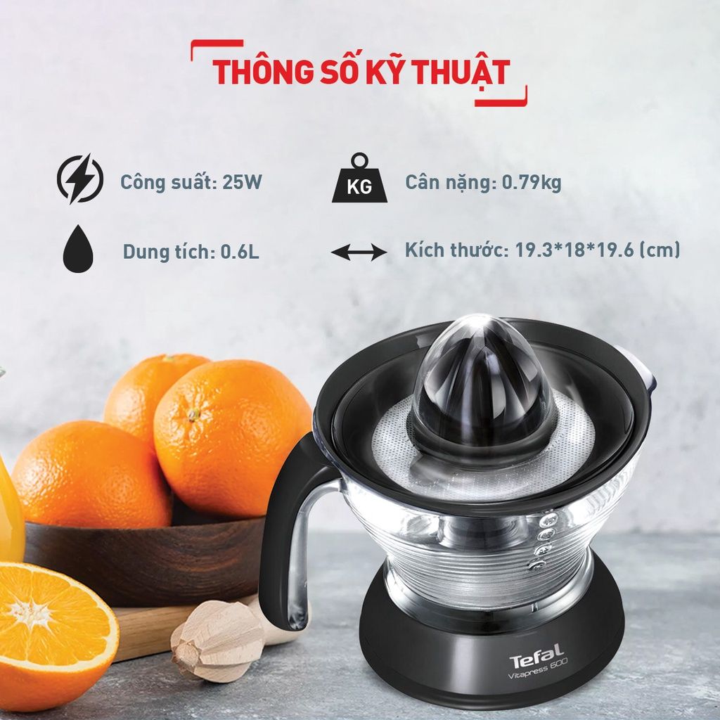 Máy vắt cam Tefal Vitapress ZP300810 hoạt động với công suất 25W, đầu xoay giúp vắt kiệt bã và giảm vị đắng. Khi kết nối với nguồn điện, chỉ cần ấn nhẹ lên đầu vắt, máy sẽ tự động vận hành.