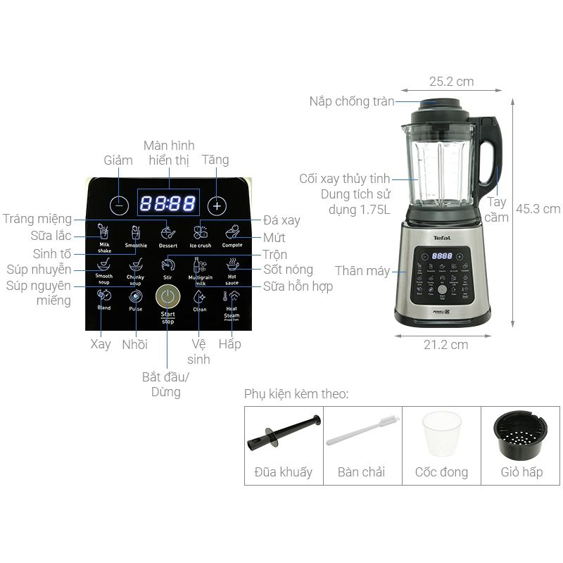 | Chức năng: | Hấp, Làm mứt, Sinh tố, Sữa lắc, Vệ sinh máy, Xay đá, Tráng miệng, Súp nhuyễn, Súp nguyên miếng, Trộn, Sữa hỗn hợp, Sốt nóng, Xay, Nhồi |