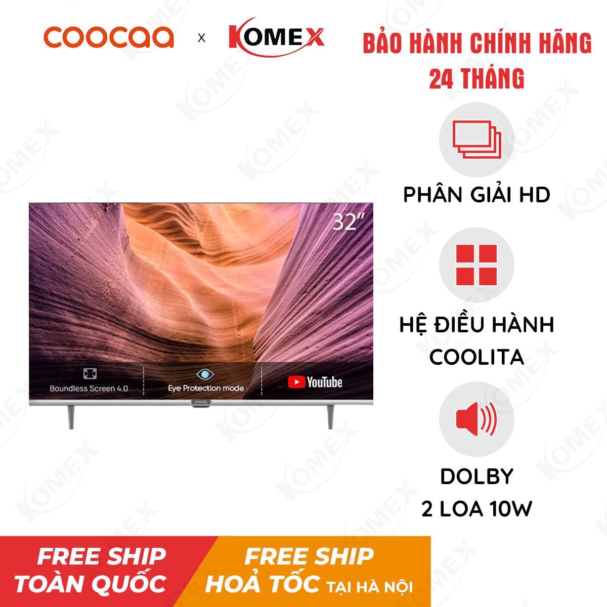 KOMEX với hơn 15 năm kinh nghiệm trong lĩnh vực Điện máy - Thiết bị điện tử, Laptop - PC - Thiết bị văn phòng và Điện gia dụng cho hơn 1 triệu khách hàng trên toàn lãnh thổ Việt Nam. KOMEX tự hào là đối tác của COOCAA, IMOU, DAHUA, EZVIZ, SKYWORTH, DSS, LYDSTO,… Với chính sách bảo hành lên đến 24 tháng, 1 đổi 1 lỗi trong vòng 7 ngày, KOMEX sẵn sàng tư vấn đúng nhu cầu, chất lượng về sản phẩm Smart Tivi HD Coocaa 32 Inch kết nối Wifi 32R5, có giấy tờ phân phối rõ ràng từ hãng phục vụ khách hàng trên toàn quốc.