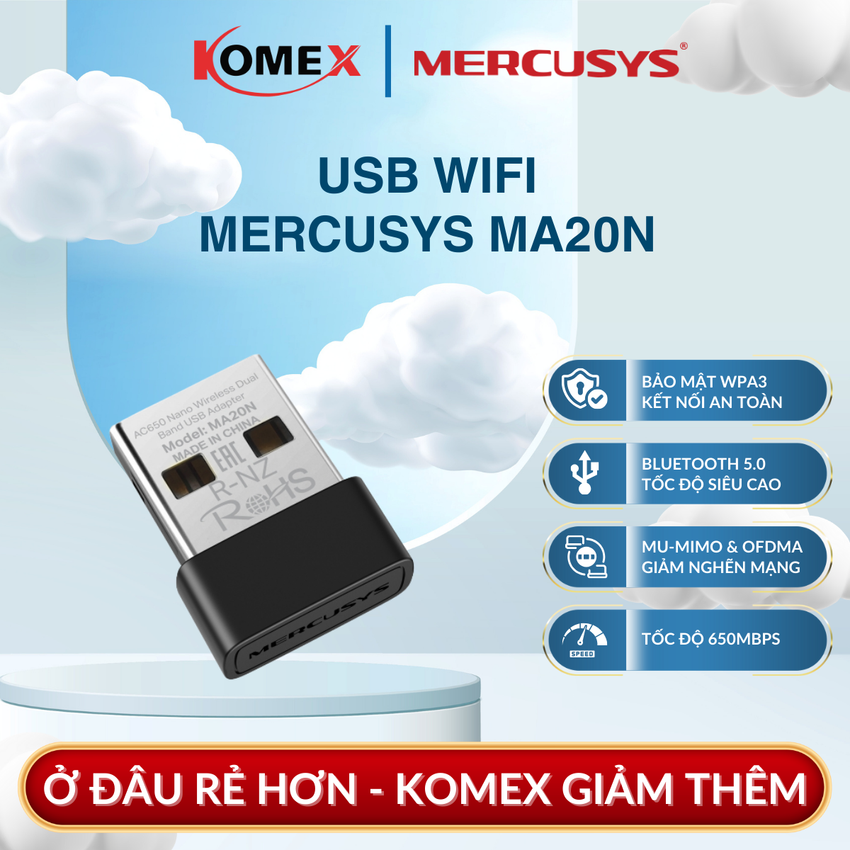USB WiFi MERCUSYS MA20NB AC650 + Bluetooth 5.0 là bộ chuyển đổi 2-trong-1 thế hệ mới, mang đến giải pháp nâng cấp Wi-Fi băng tần kép và Bluetooth chỉ với một cổng USB. Thiết kế nano cực nhỏ, cắm là dùng, đặc biệt phù hợp cho máy tính để bàn và laptop hiện đại.